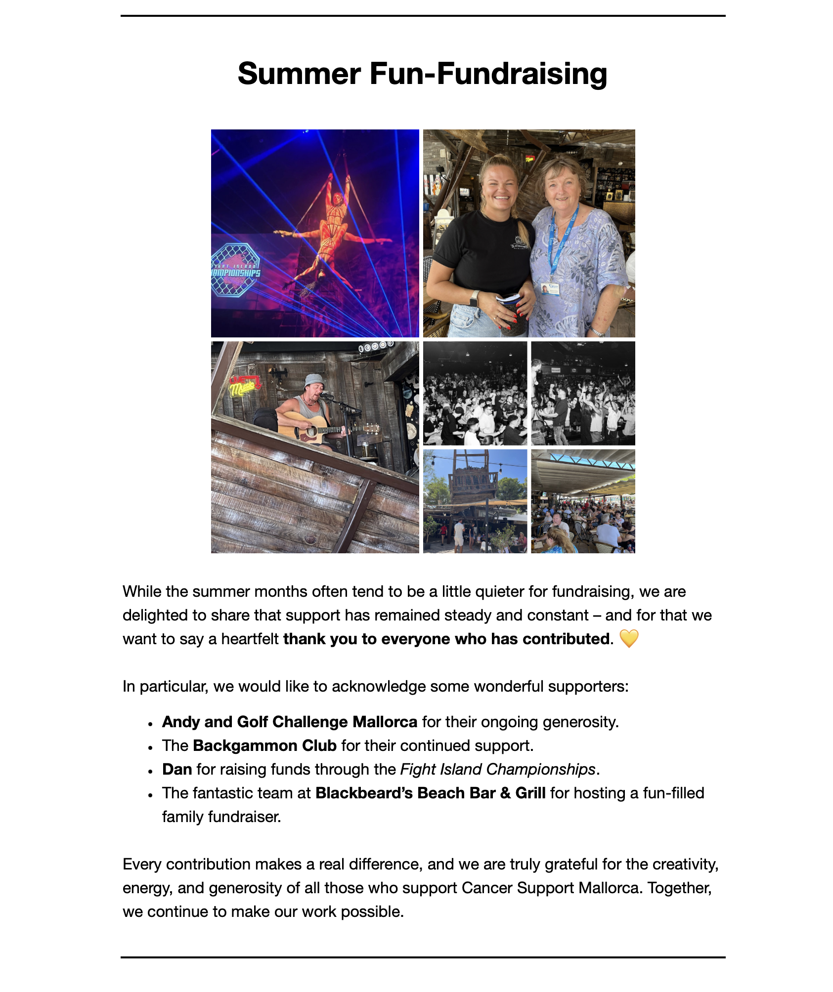 Although a comercial enterprise, GCM donates per season and promotes their activities through ticket advertising and newsletter information. In memory of their founder Krista Hyer, an inspiration to us all. Her dedication to the cause, helped and changed the lives of countless people suffering in Mallorca.